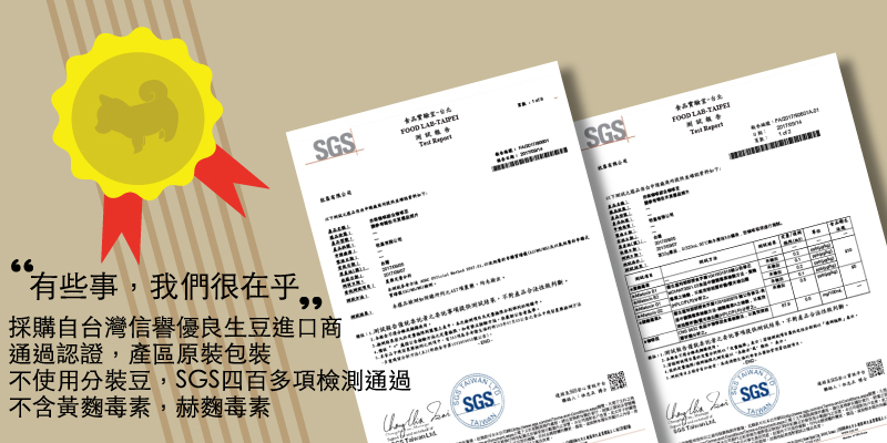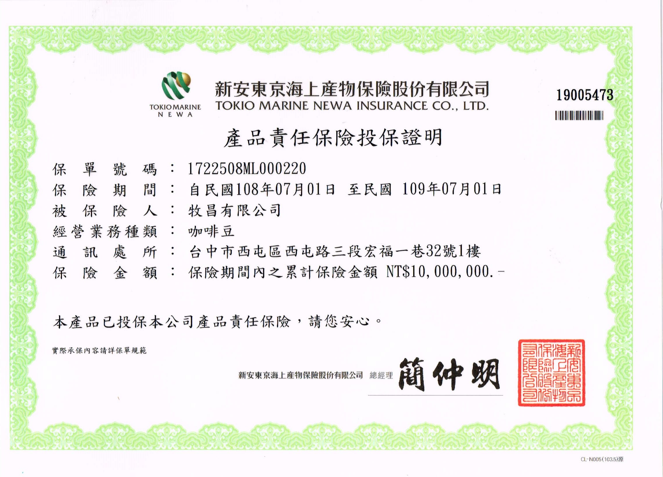 本公司出品之咖啡豆通過SGS認證並投保新安東京海上產險產品責任險
